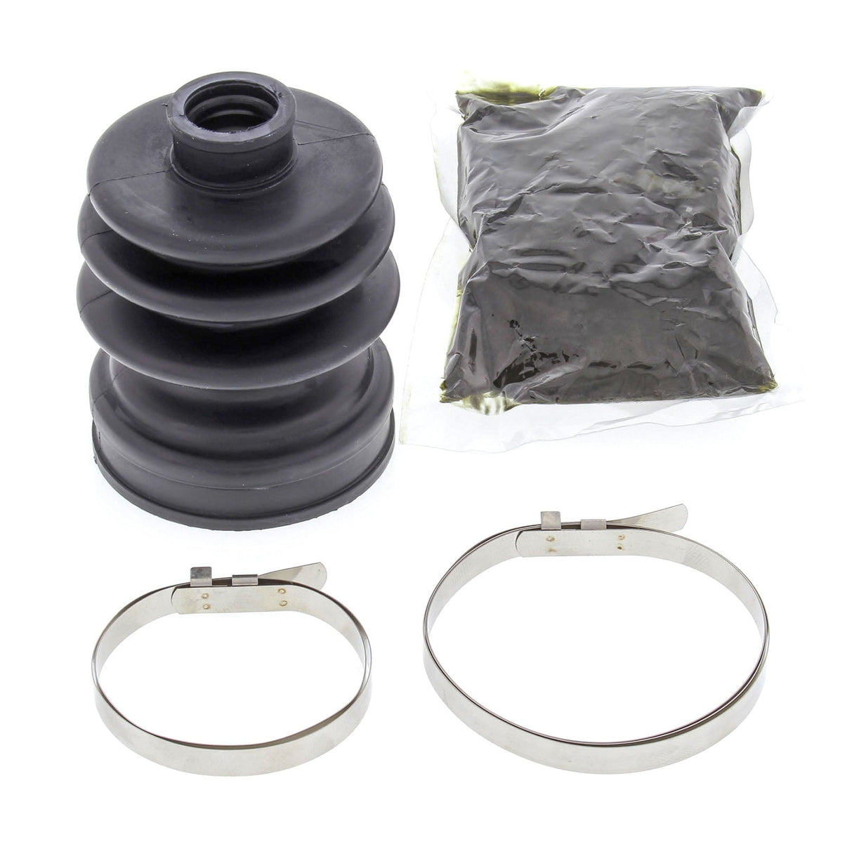 The All Balls CV Boot material is compounded from an OEM grade DCR66 rubber that is formulated specifically for the demanding requirements of today’s ATV’s and UTV’s. 40% higher tensile strength than conventional CV boot material, suitable for the high joint angles of today’s ATV’s and UTV’s. 50% more abrasion resistant than conventional CV boot material to assure long life in today harsh off-road environments. Rubber compound is tested to -40° F to assure good performance and long life at low temperatures. Kits include two Stainless steel clamps that are designed to be tightened without the use of special tools. Lithium based Molybdenum Grease insures good lubrication for long CV joint life. Easier to install than most OEM and aftermarket boots. Sold each. Does not require the use of a "Banding Tool".