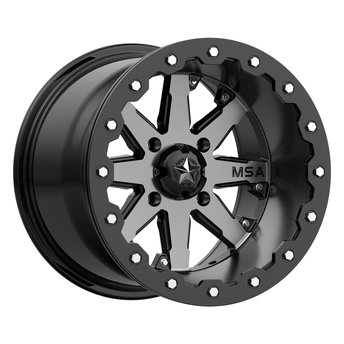 The M21 Lok is beauty, function and performance all engineered to push your machine to the next level.  Each M21 Lok wheel comes with all of the necessary parts to professionally lock any tire to your wheels, ensuring a safe and quality ride.  What makes this beadlock UTV wheel different from the rest is because of a couple unique MSA attributes. The finish we used on this wheel is a gunmetal, which is actually a dark tinted clear-coat that is overlaid on top of the micro-machined wheel face.  The Gunmetal finish is accented with gloss black automotive grade paint, only offered by MSA.  The unique M21 Lok wheel design sheds weight, dirt, mud and debris fast, making clean up a snap.  Racer proven, ride ready. Backed by a full lifetime structural warranty, you bend it or break it, we replace it.